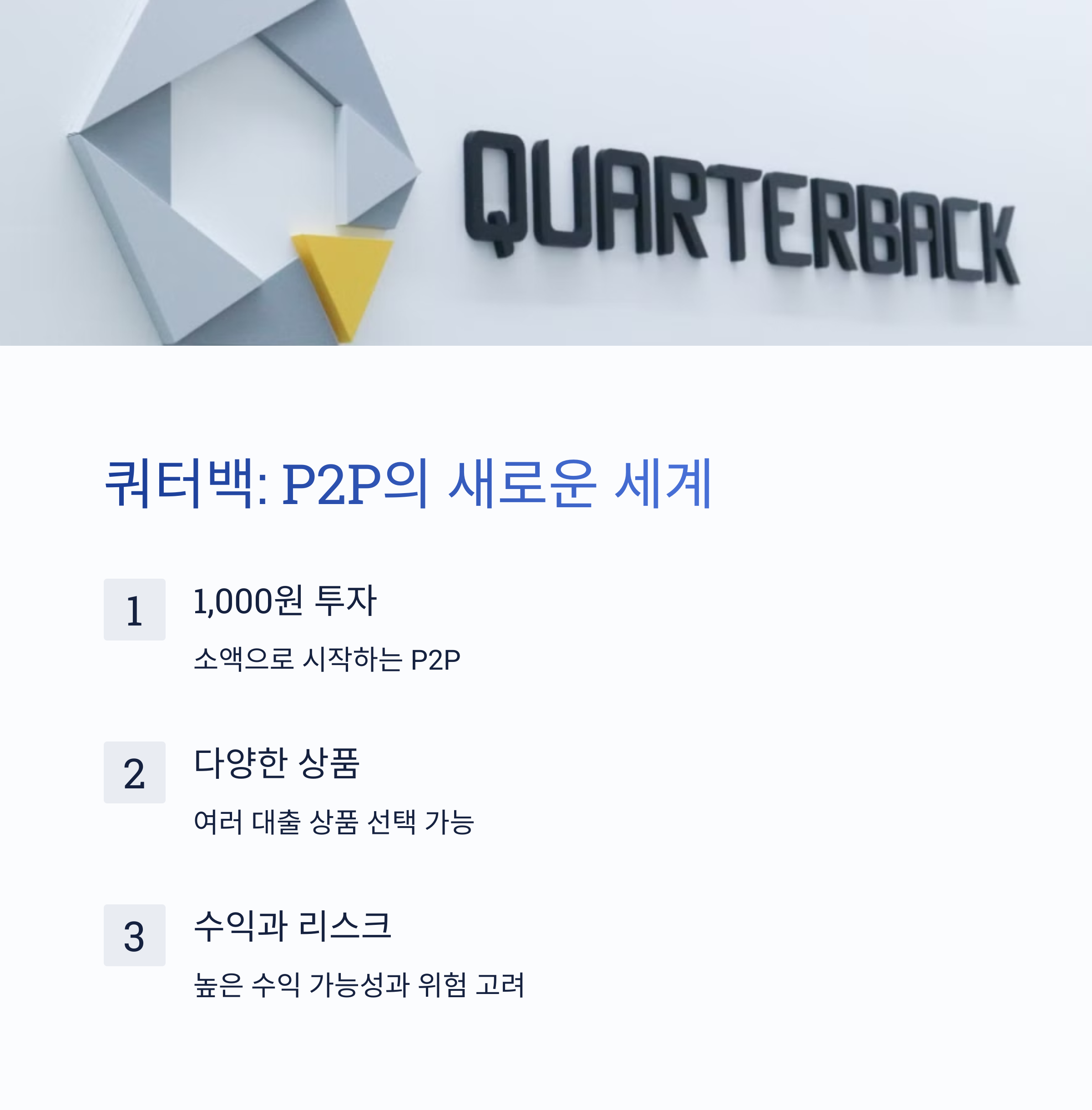 • ํˆฌ์žํ•œ๋„: P2P ๊ฐ™์€ ๊ฒฝ์šฐ ๊ฐœ์ธ ํˆฌ์žํ•œ๋„๊ฐ€ ์žˆ์–ด์š”! (์ฟผํ„ฐ๋ฐฑ์€ ์ตœ๋Œ€ 5์ฒœ๋งŒ์›)